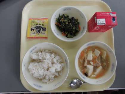 6月25日(木)の献立は,麦ごはん・牛乳・鶏肉ととうふのくず煮・ほうれん草のごま煮・黒大豆でした。けずりぶしのだしの味がきいた,にんじん・干しいたけ・たまねぎ・しょうがの入ったとうふのくず煮。かたくり粉パワーでとろみのついた豆腐献立で美味しくいただきました。暑いので,しょうがの味がほんのり食欲をそそります!