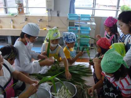 若草学級 3年生 公開日 2011/06/21 更新日 2011/06/21 学校からのお知らせ 女性会の方と一緒にちまきを作りました。 上新粉と砂糖と水を混ぜたお餅を、葦(よし)の葉っぱで包んで ゆでました。 葦の香りがして美味しいちまきができました。
