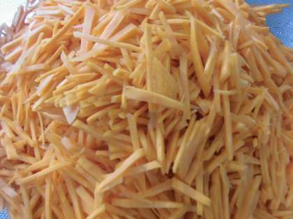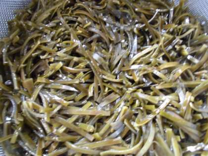 また,野菜の切り方も献立により,またその日の食材の納入される大きさ・硬さをみながら工夫して切っています。今日の「にんじん」は細切りこんぶに合わせて,調理員さんが丁寧にせん切りしてくださいました。機械で切るのとは違い,切り口がきれいで,なめらかな口当たりになります。出来上がりも色鮮やかに仕上ります。やわらかく煮て下さっていたので,子どもたちもよく食べていました。調理員さんの愛とお酢パワーで元気モリモリ!