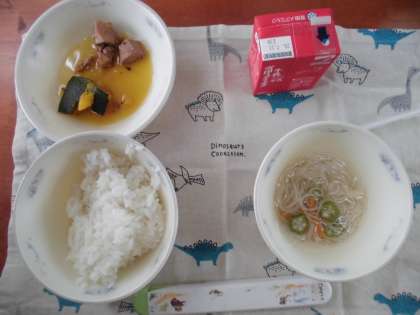 7月3日(金)の献立は,ごはん・牛乳・なま節のしょうが煮・かぼちゃの煮つけ・七夕そうめんでした。今日は七夕の行事献立でした。