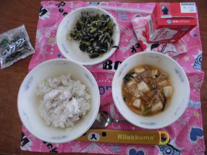 7月6日(月)の献立は,麦ごはん・牛乳・とうふの四川風・ほうれん草ともやしのいためナムル・じゃこでした。
