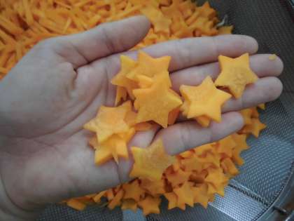 献立のイメージに合わせて,野菜の切り方や大きさを考えています。今日はもやしに合わせ,しいたけも,たけのこも,人参もせん切りにします。その中で,「がんばれ!」という願いが込められた星型の人参はしっかり一年生へと届いていました。今日もまた野菜と仲良くなれた一年生がいました。