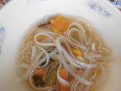 「おいしい!」とパクパク食べる一方で,苦手な食べ物と向き合っている児童もいます。苦手な野菜と仲良くなるために,一生懸命頑張る一年生のために,今日は「米粉(ミーフン)」の中に入る人参を星型にしてくださいました。