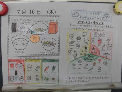 7月16日(木)の献立は,麦ごはん・牛乳・こぎつねちらし(具)・だいこん葉のいためもの・キャベツのすまし汁・手巻のりでした。