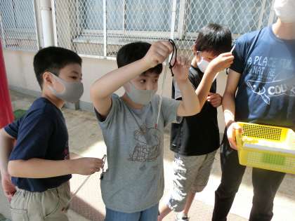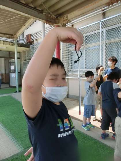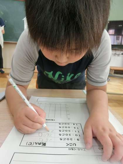 天気と気温の学習2 公開日 2020/07/20 更新日 2020/07/20 若草学級 1日の気温って,どんなふうにかわっていくのかな? 百葉箱のそばで,温度計を使って1日の気温を測りました。 「25度だ!」 「朝より高いよ。」 それぞれの時刻の気温をプリントに記録していきました。