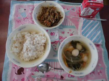 今日の献立 公開日 2020/09/01 更新日 2020/09/01 学校の様子 8月31日(月)の献立は,麦ごはん・牛乳・和風ドライカレー・はるさめスープでした。 今日は8月31日でゴロ合わせで,「やさいの日」でした。 今日の給食では,にんじん・ごぼう・しょうが・たまねぎ・もやし・チンゲン菜とたくさんの野菜を使った献立でした。美味しくいただきました。