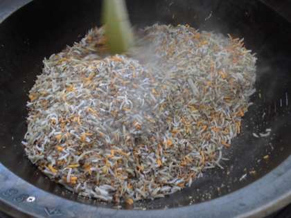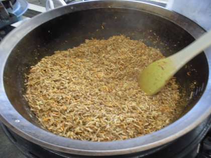 この写真の違いわかりますか?最初は左の写真のように,ごぼうやこんにゃくにはほとんど色がついていないのですが,よく炒めていくことで,右の写真のように,赤味噌・カレー粉・トマトケチャップ・ウスターソース・塩・こしょう・ガーリックパウダー・濃口醤油で調味した特製ドライカレーに変身いたしました。