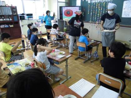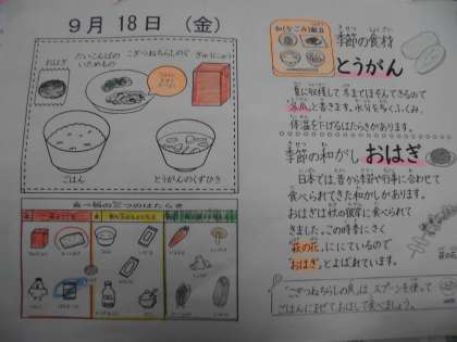 今日は,夏休み明け初めての和給食でした。和献立の日は「だしのうま味を味わう日」けずりぶしでとっただしのうま味と,鶏肉のうま味がよく出た「とうがんのくずひき」は残暑が厳しい日に食べやすい一品でした。