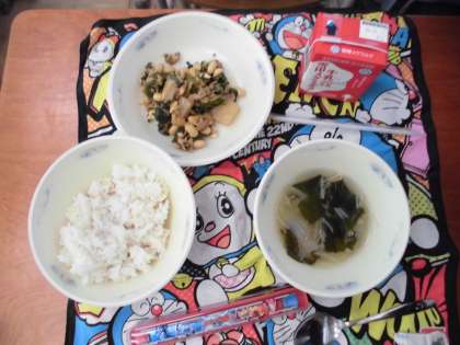 9月23日(水)の献立は,麦ごはん・牛乳・肉みそいため・わかめスープでした。