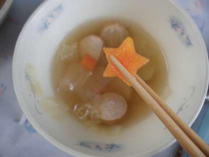 ソーセージと野菜のスープ煮には野菜が苦手な児童への「おもいやりにんじん」が入っていました。一年生のクラスでも野菜と向き合い頑張って食べていました。