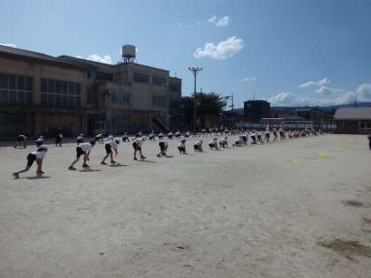 体育の学習の様子です。 体育フェスティバルに向けて,音楽に合わせた動きの確認をしています。