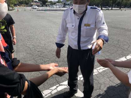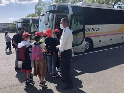 6年生修学旅行 バスに乗って倉敷へ 公開日 2020/10/05 更新日 2020/10/05 6年生 昼食を食べて,次に向かうのは「倉敷・美観地区」です。バスに乗る前に消毒をします。さあ,いよいよ出発です。次に訪れる場所はどんな場所なのでしょうか。楽しみです。