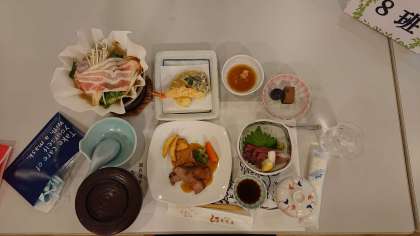 6年生修学旅行 公開日 2020/10/06 更新日 2020/10/06 6年生 夕食はてんぷらにお刺身,お鍋など写真のようなメニューでした。楽しく会話しながらではないですが,おいしい料理に満足している様子でした。