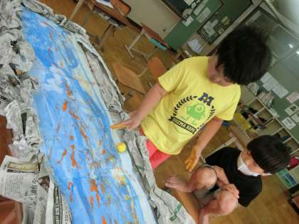 ハケで色をぬって,ゴルフボールに絵の具を付けてコロコロ〜。