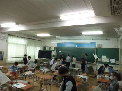 図画工作の学習の様子です。 身の回りのものを新聞紙で包み,様子を調べました。