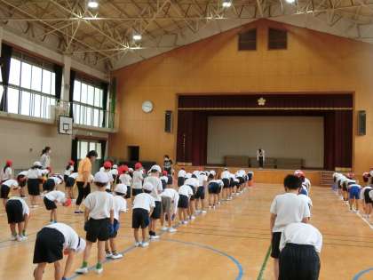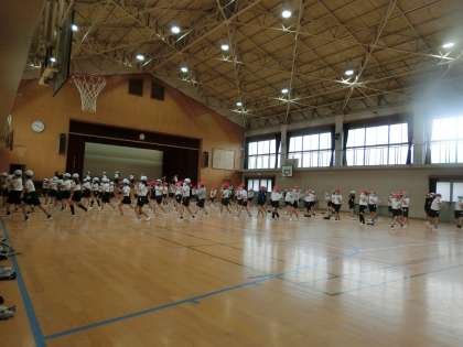 前日から降り続いた雨のため,低・中・高学年ごとの通し練習は体育館でしました。