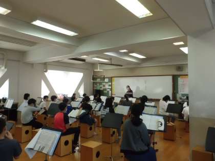 音楽の学習の様子です。 音楽室で,スクールサポーターの先生が授業をしています。