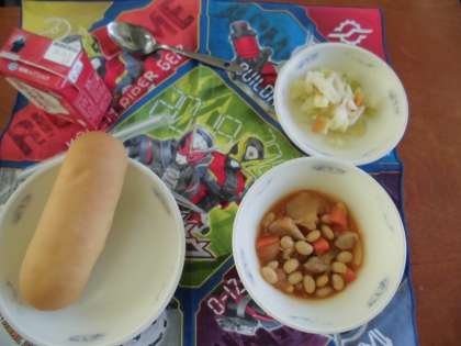 10月13日(火)の献立は,コッペパン・牛乳・大豆と鶏肉のトマト煮・野菜のホットマリネでした。