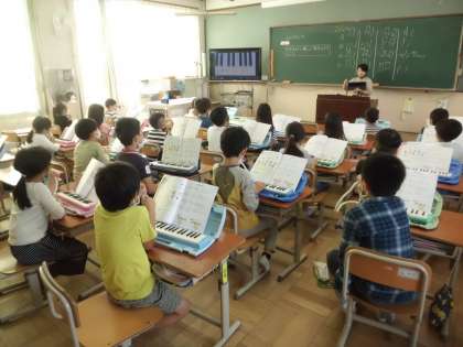 音楽の学習の様子です。 大型テレビに鍵盤の様子をうつしながら,鍵盤ハーモニカの練習をしています。