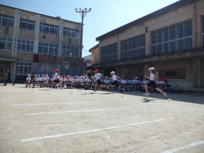 中学年は80mです。カーブの走り方も大切ですね。最後まで走り抜けました。