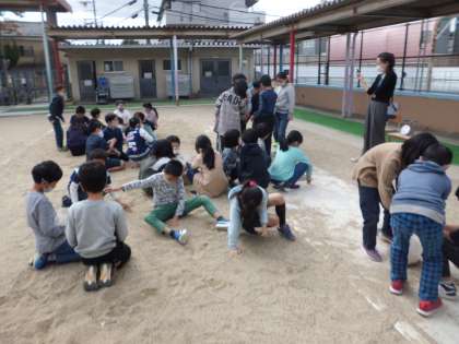 算数の学習の様子です。 『重さ』の学習が始まりました。 砂場で,1kgをめざして,グループで袋に砂を入れました。