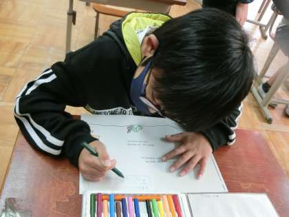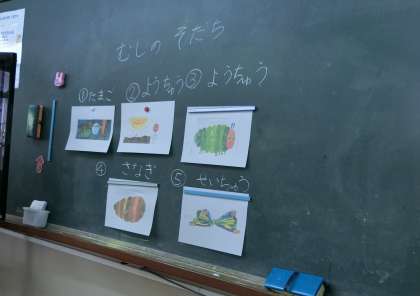 若草学級 生活科・理科の学習1 公開日 2020/10/30 更新日 2020/10/30 若草学級 【はらぺこあおむし】のお話を読んだ後,昆虫の成長の様子について学習しました。 『ようちゅう』や『さなぎ』の言葉を覚えました。 寒くなってきて,虫の姿は少なくなってきましたが,今日,若草学級の前に小さなショウリョウバッタを見つけました。細い体でとても寒そうに見えました。そっと,花壇に逃がしてあげました。