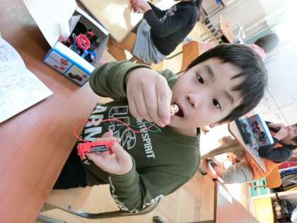 「豆電球をつないでみよう。・・・あ!ついたついた!!」