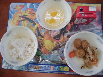 そして,あら不思議!食器に配食する時は液体だった物が,麦ごはんやおかずを食べ終わるころには固まっています。寒天パワーの不思議を楽しみながら,給食をいただいていました。