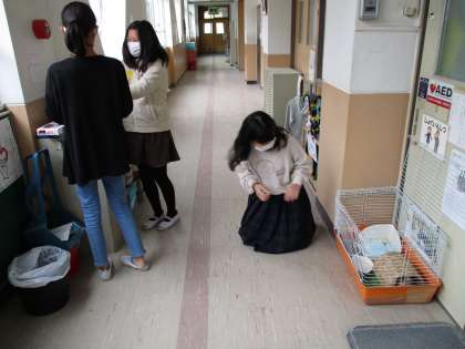 中間休みの様子です。 飼育委員会の子どもたちが,ウサギの世話をしています。
