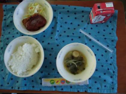 みそ汁には,たまねぎ,切りふ・わかめが入っていました。3年生のすがたをかえる大豆の学習で,色々なすがたをかえる食べ物を給食ビデオで紹介しています。「ふ」は小麦粉が変身した食べ物です。
