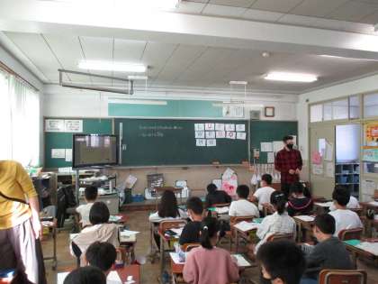 外国語活動の学習の様子です。 今日は,ALTの先生と一緒にアルファベットの学習をしました。