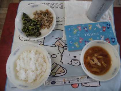 11月25日(水)の献立は,ごはん・牛乳・とりめし(具)・だいこん葉のごまいため・さつまいものみそ汁でした。