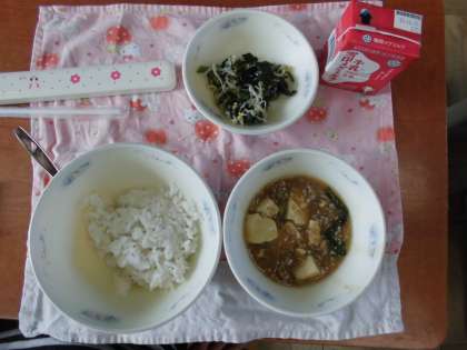 豚ミンチ肉のうま味と,玉ねぎの甘味がっぷりのマーボ豆腐が登場しました。片栗粉でとろみがついたマーボ豆腐は温かく,ご飯によく合いました。