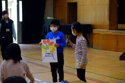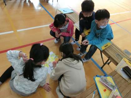 『あ・い・う・え・おはよう』という学校自慢のお話を聞き,明親小学校のいいところについてグループで考えました。