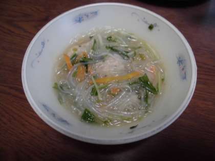しょうがの味が効いて,細ねぎ・鶏ひきにく・まぐろフレークが入った食べ応えのあるふんわりフワフワのつみれです。はるさめのツルんとした食感も楽しめました。