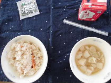 みそ汁には乾燥キャベツ・乾燥ごぼう・ふが入っていました。