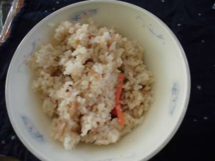 今日は,給食室で保管しておいたアルファ化米・まぐろ油漬・たけのこ缶・乾燥にんじん・干しいたけを使った炊きこみ五目ごはんでした。