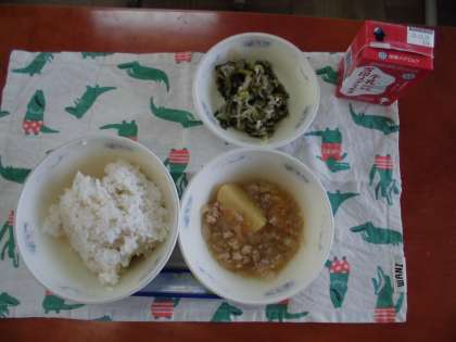 12月21日(月)の献立は,麦ごはん・牛乳・じゃがいものそぼろ煮・切干大根のごま煮でした。