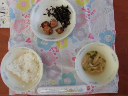12月23日(水)の献立は,ごはん・牛乳・さけの塩こうじあげ・小松菜とひじきのいためもの・京野菜のみそ汁でした。
