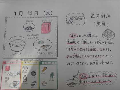 冬休み明けの給食は,1月8日(金)からです。冬休み前に給食当番だった人は,エプロンを給食開始までに持ってきてください。よろしくお願いします。