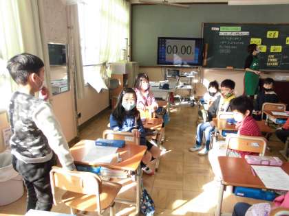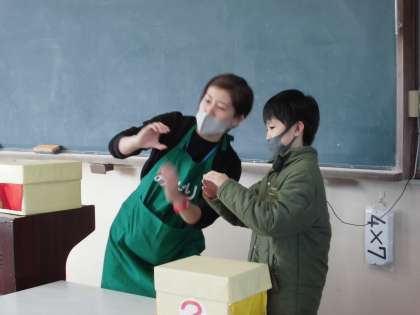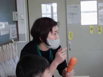 はてなBOXに手を入れて,どんな野菜が入っているのか,形や大きさ,手触りをヒントにみんなで考えました。