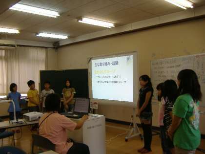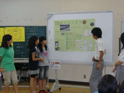 7月25日,9時30分から正午まで,大淀中学校生徒会と明親・美豆小学校児童会の子どもたちが,自校の取組をそれぞれ交流したり,3校混合グループに分かれてでワークショップをしたりしました。ワークショップでは,まず東日本大震災について,実際にどれくらいの被害があり,被災地の人たちはどんなことで困っておられるのかを資料をもとに確かめました。その後,中学生がリーダーシップをとり,それぞれの学校で「震災の様子を知ってもらい,一人一人できることから行動してもらえる」よう,壁新聞のかたちにまとめていきました。最後は,各グループごとに完成した壁新聞をもとに発表会をしました。この交流会の取組は,夏休み明けの委員会活動で再度ふり返り,児童集会等を通して全校に発信していく予定です。