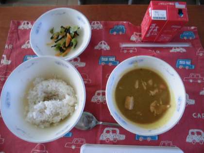1月25日(月)の献立は,麦ごはん・牛乳・チキンカレー・小松菜のソテーでした。