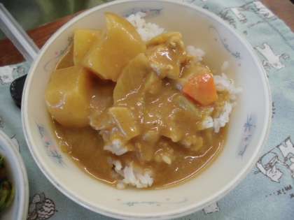 じゃがいもはホクホクしており,野菜の甘味も感じられるなめらかなルウでした。ごはんが進み,美味しくいただきました。