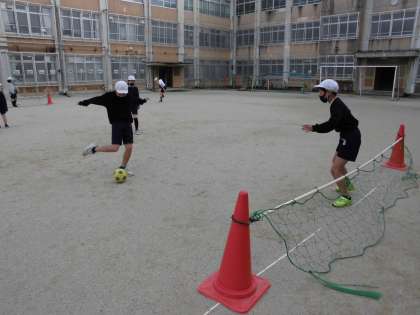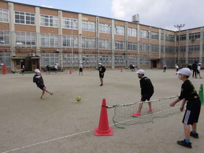 4年生 体育 公開日 2021/02/03 更新日 2021/02/03 4年生 『サッカー』の学習をしています。 今日は,シュートの練習をしました。 相手をよく見てパスを出すことや,ゴールのあいているところを狙ってシュートを打つことに気をつけました。