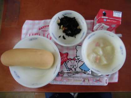 2月9日(火)の献立は,コッペパン(国内産小麦100%)・牛乳・じゃがいものクリームシチュー・ひじきのソテーでした。