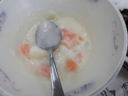 やはり,寒い季節にはクリームシチューが心も体もほっこりします。白色のシチューの中に星型の人参があるとラッキー。給食調理員さんの「おもいやり人参」です。