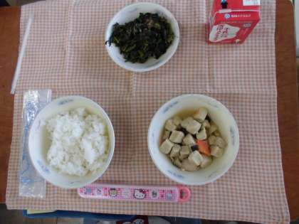 2月12日(金)の献立は,ごはん・牛乳・高野どうふと野菜のたき合わせ・ほうれん草のおかか煮でした。