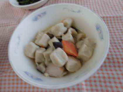 けずりぶしのうま味をいかした「高野豆腐と野菜のたき合わせ」。美味しさのポイントは,高野豆腐だけをけずりぶしからひいただし汁・さとう・薄口醤油でじっくり煮詰めている事です。別の釜でしいたけ・鶏肉・にんじんをに含めます。