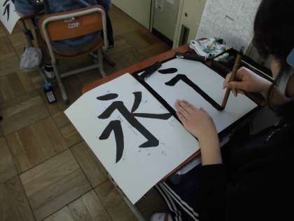 4年生 書写 公開日 2021/03/10 更新日 2021/03/10 4年生 「大筆名人になろう」というめあてに取り組みました。 今日は,すべての点画が入っている『永』という漢字を書きました。 今までの学習を思い出しながら,丁寧に書くことができました。